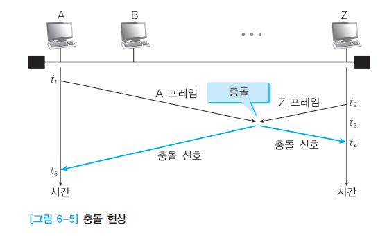 전파지연시간 내에 두개 이상의 스테이션이 동시에 전송을 개시하는 경우, 전송 패킷 간의 collision발생