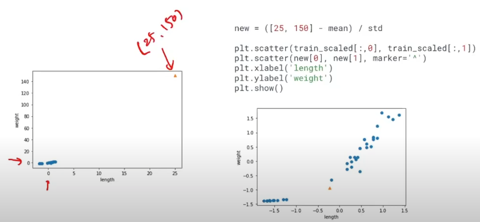 수상한 도미도 훈련 데이터의 평균, 표준편차로 변환을 해줘야 한다.