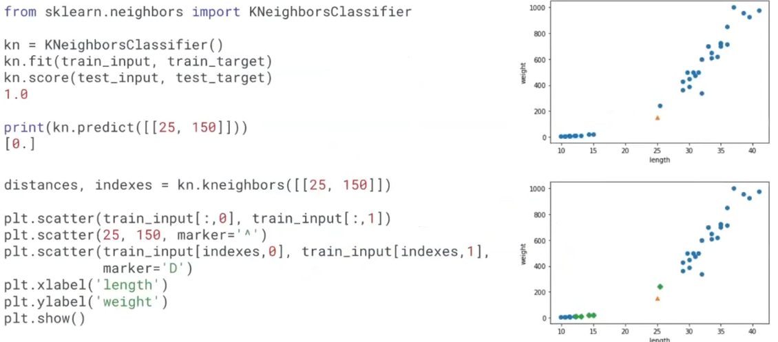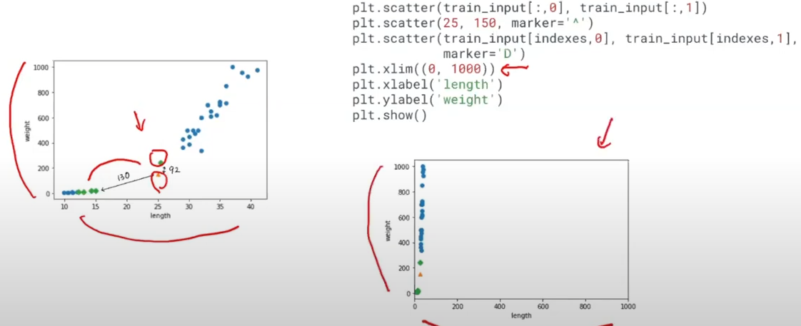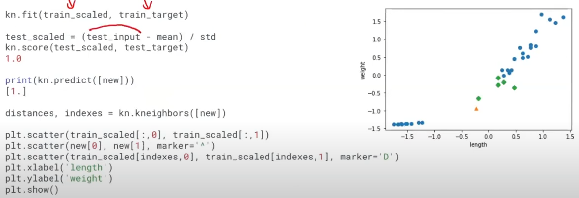 표준점수로 훈련데이터는 바꿨는데 도미도 표시데이터로 바꿔줘야 한다.