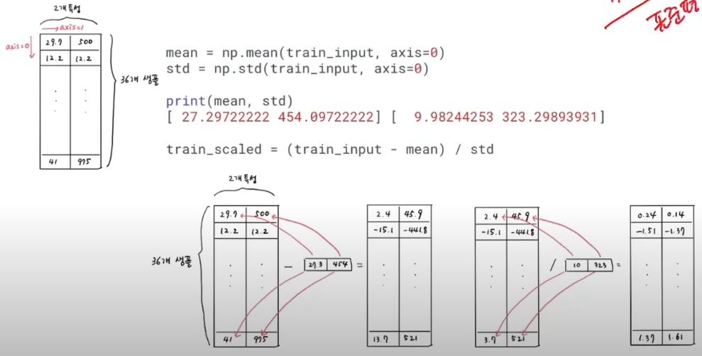 그리고 테스트 세트도 훈련 세트의 평균, 표준편차를 사용해서 scale을 맞춰준다.
