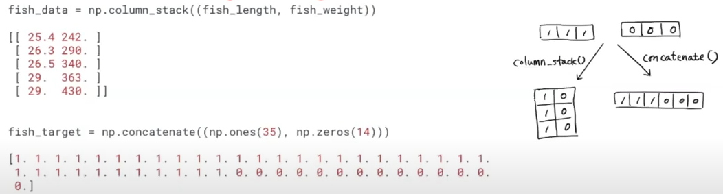 fish_length를 1열에, fish_weight를 2열에 넣어서 2차원 배열을 만든다.