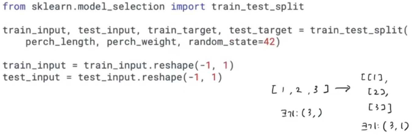 여기서 perch_length는 1차원 배열이기 때문에 결과인 훈련세트, 테스트세트 다 1차원 배열이다.