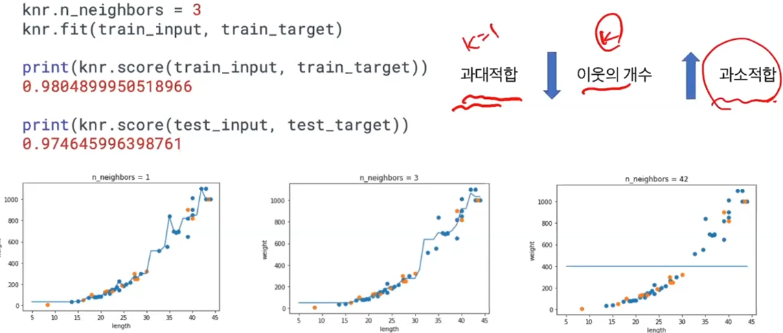이웃을 3으로 줄이고 훈련하니 훈련, 테스트 세트의 군형을 맞췄다.