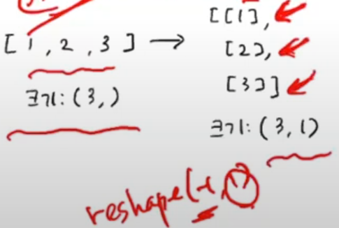 reshape(-1, 1 ) 첫 번째 행 차원을 -1로 지정하고 (= 나머지 차원이 결정되고 나머지 차원으로 할당하겠다)