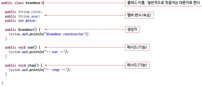 클래스 – 멤버변수(속성), 메서드(기능), 생성자
