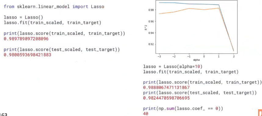 알파 값이 작아지면 규제가 없어지니 훈련세트에만 잘 맞는 결과가 나오니 과대적합된 상태이다.