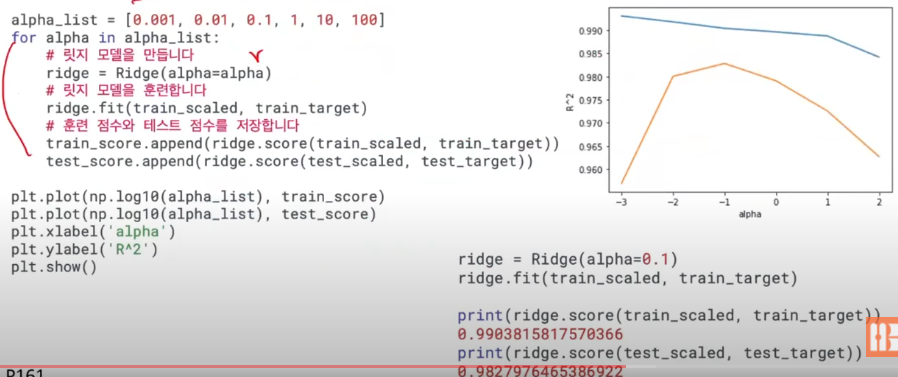 Ridge객체에 train_scaled(표준화한 것), train_target(맞춰야될 것)을 넣어준다.