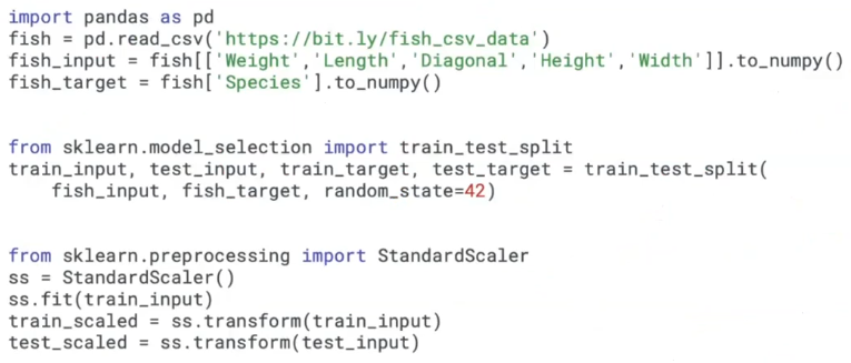 항상 훈련세트에서 찾은 통계값으로 훈련세트, 테스트 세트를 둘다 조정한다.