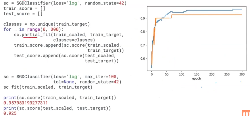 SGDClassifier를 다시만들때 max_iter를 100으로 설정(에포크=100)