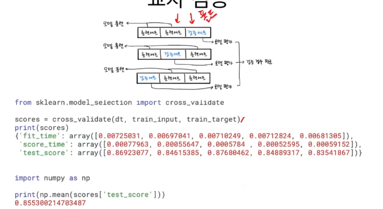 처음에 나눴던 train_input,target을 가지고 알아서 검증세트(폴드)를 바꿔가면서 진행한다.