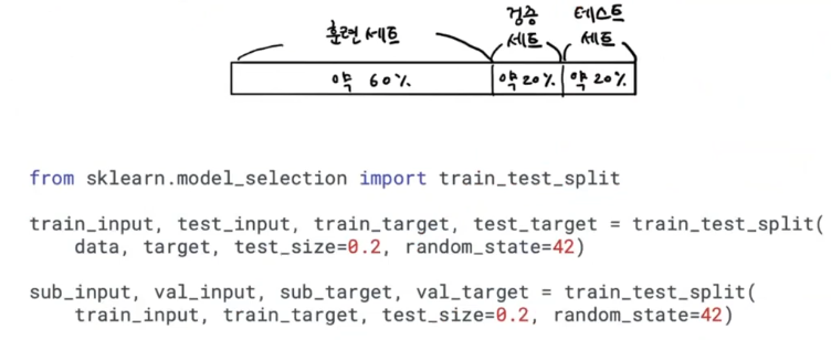 검증 세트에서 최적의 파라미터를 찾으면 훈련세트와 묶어서 다시 최종 훈련을 진행한다.