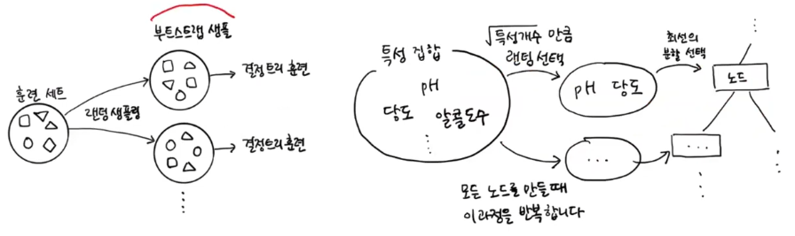 각각 트리를 만들 때 훈련세트를 바꿔서(중복 세트를 포함) 결정트리를 여러개 만들고 각각 예측값의 평균을 구하는 것이 랜덤 포레스트이다.
