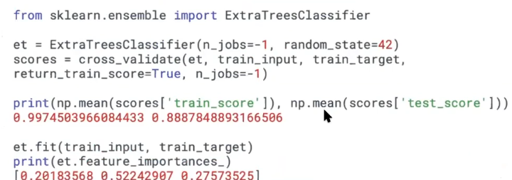 기본은 검증세트의 값만 반환했다. 훈련 세트의 점수도 뽑기 위해서 return_train_score를 지정해준다.