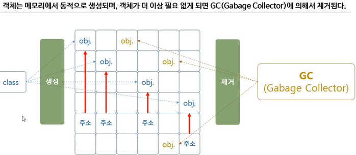 객체가 필요 없다면 관계를 끊어버리고 노랑 obj처럼 허공에 떠돌아다니게 된다. 그러면 GC(Gabage Collector)가 노랑 obj를 회수해서 지워버리게 된다.