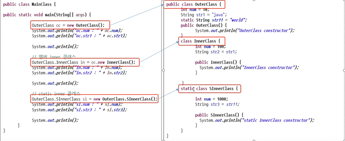 클래스 안에 또 다른 클래스를 선언하는 것으로 이렇게 하면 두 클래스의 멤버에 쉽게 접근할 수 있다.