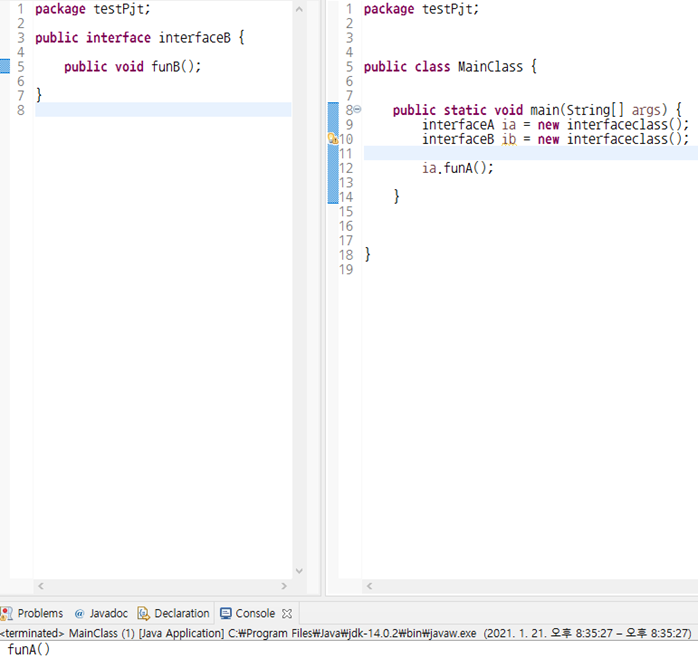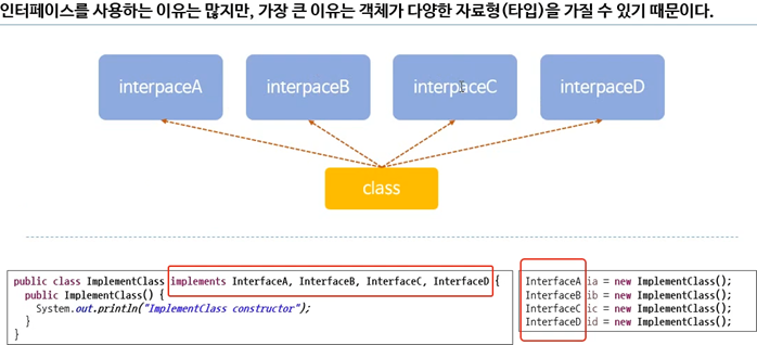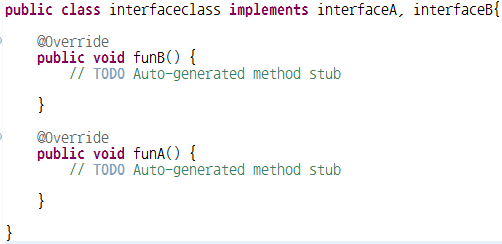 main에서 interfaceA로 만든 ia는funA 매서드 밖에 못사용한다. interfaceclass를 만들었지만 interfaceA형 이기 때문