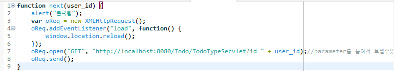 oReq.open("GET", "location.href='http://localhost:8080/Todo/TodoTypeServlet?id="+user_id);//parameter를 붙여서 보낼수있음.