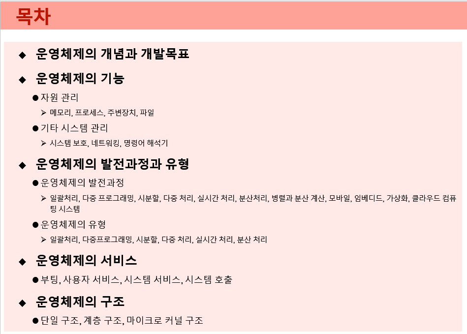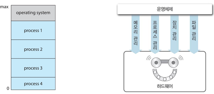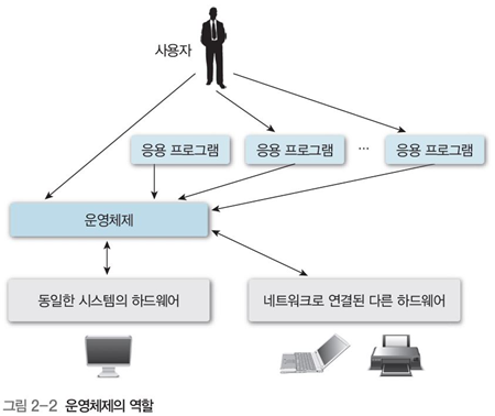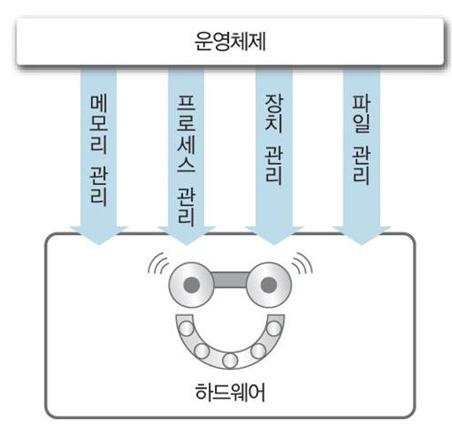 컴퓨터 시스템을 구성하는 하드웨어와 사용자 또는 응용프로그램의 중간에 위치하여 쉽고 간편하게 컴퓨터 시스템을 이용할 수 있도록 컴퓨터 시스템을 제어하고 관리하는 시스템 소프트웨어