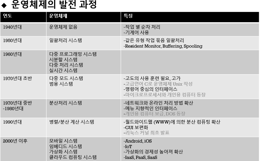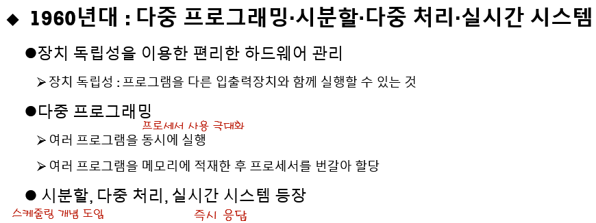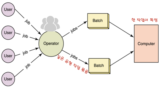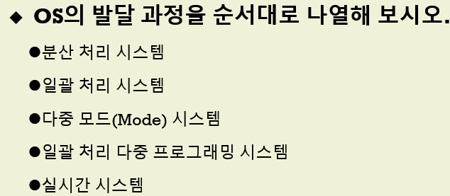 일괄 처리 시스템 -> 일괄 처리 다중 프로그래밍 시스템 -> 실시간 시스템 -> 다중 모드 시스템 -> 분산 처리 시스템