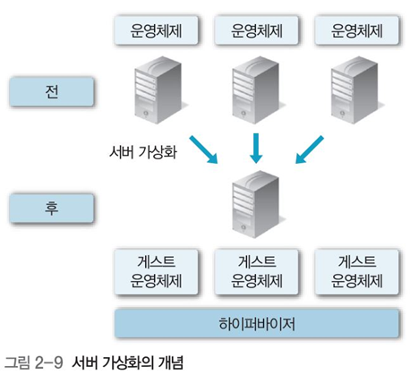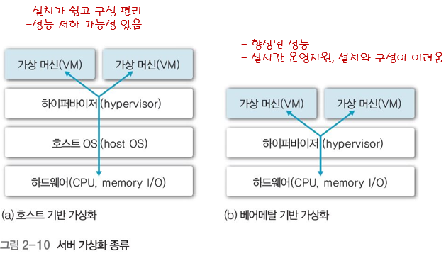 - 베어메탈bare-metal 기반 가상화 : 호스트 운영체제 설치 전 가상화 솔루션을 탑재