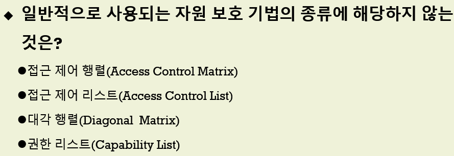- 보호 : 자원에 대한 사용자나 프로세스의 접근 제어 메커니즘