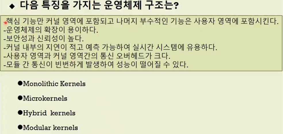 마이크로 커널은 커널은 작게하고 운영체제가 해야할 나머지 모듈들을 사용자 영역으로 넘기는 것 입니다.