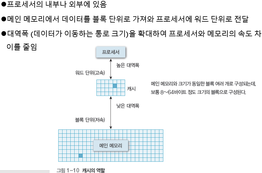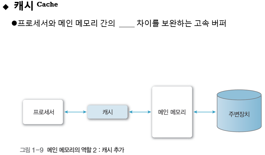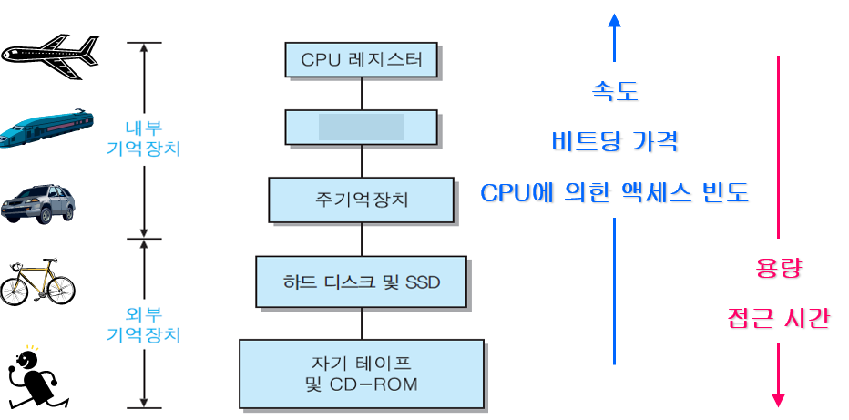 - 기억장치를 계층적으로 구성하여 비용, 속도, 용량, 접근시간 등을 상호 보완
