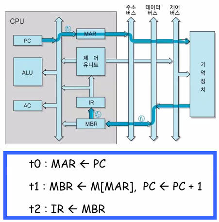 - 메모리에서 명령어를 읽어 명령어 레지스터 (IR)에 저장하고, 프로그램 카운터 (PC)를 증가시킴