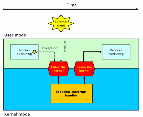 프로세스가 실행될 때 인터럽트가 발생하면 커널로 들어가서 처리를 한다음 다시 프로세스가 실행됩니다.