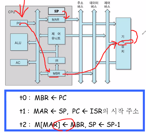 인터럽트 서비스 루틴으로 가야하기 때문에 돌아올 주소를 저장해야 합니다.
