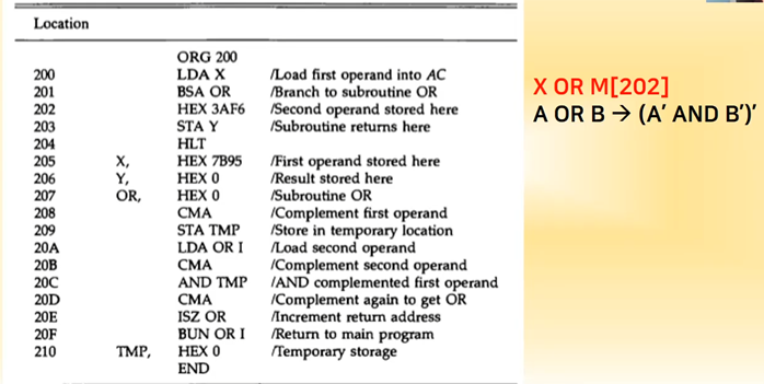 OR 서브루틴을 보면 LDA OR I를 또 하는데 이미 AC에는 X의 값이 있고 그걸 변수 TMP에 저장해두었다.