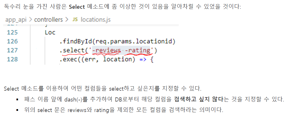 select에서 reviews 필드를 제외하고 가져온다는 것입니다.