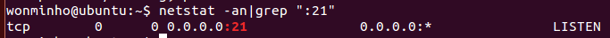 netstat -an|grep ":21" 으로 21번 포트가 있는지 확인 합니다.