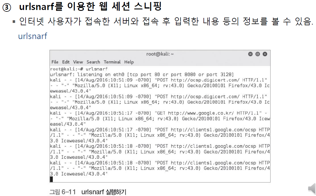 urlsnarf를 하고 사이트에 접속하면 어디 사이트에 접속했는지 알 수 있습니다.