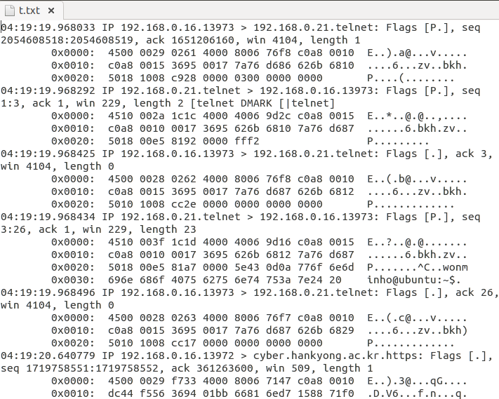 tcp 페킷위에 텔넷이 올라가 있습니다.