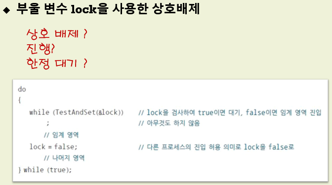 상호배제 - lock변수가 false가 아니라면 임계영역에 누군가 들어가 있다는 뜻이니 다른 변수가 들어가지 못하게 됩니다. 그래서 상호배제를 만족합니다.