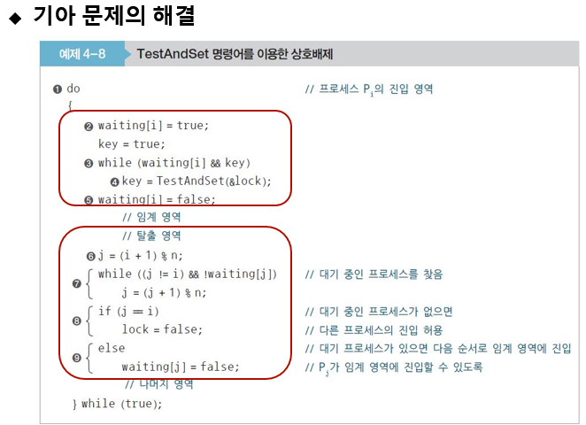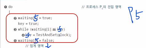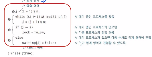 진행 - waiting이 다른 프로세스 모두 다 false라면 lock을 false로 해놔서 다른 프로세스의 임계영역 진입을 허용합니다.