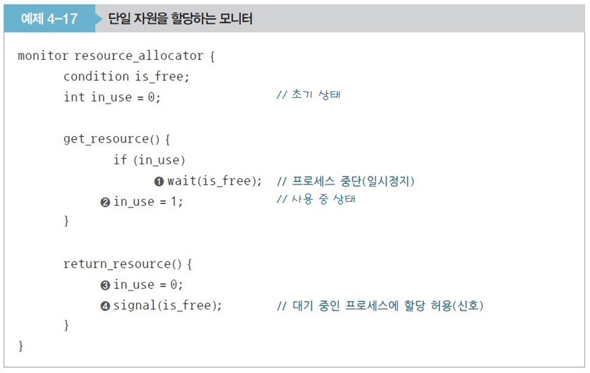 이때 대기하는 프로세스에 신호signal가 오면 in_use=1로 바꾸어 사용 중 알림 후 리소스 사용 - 자원 사용 끝나면 in_use=0으로 바꿔 사용 가능 알림 (❸).