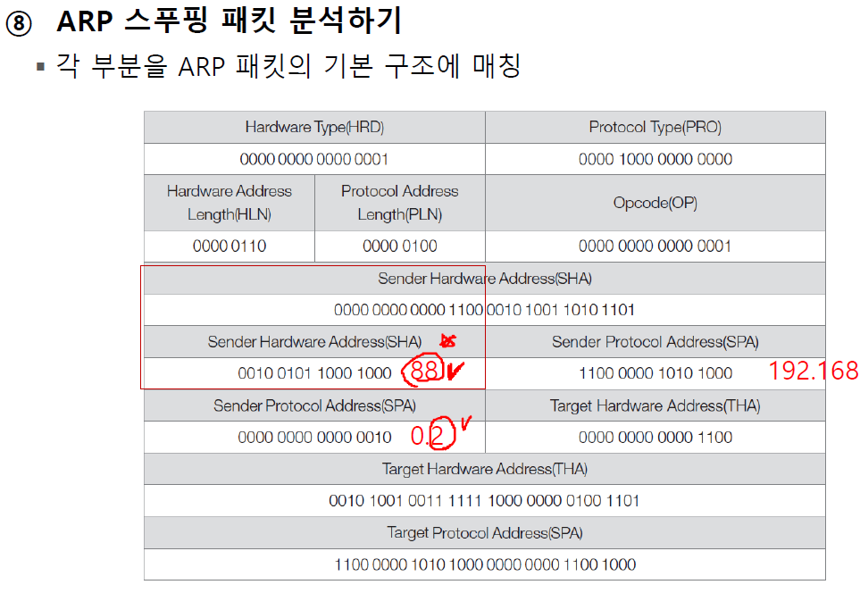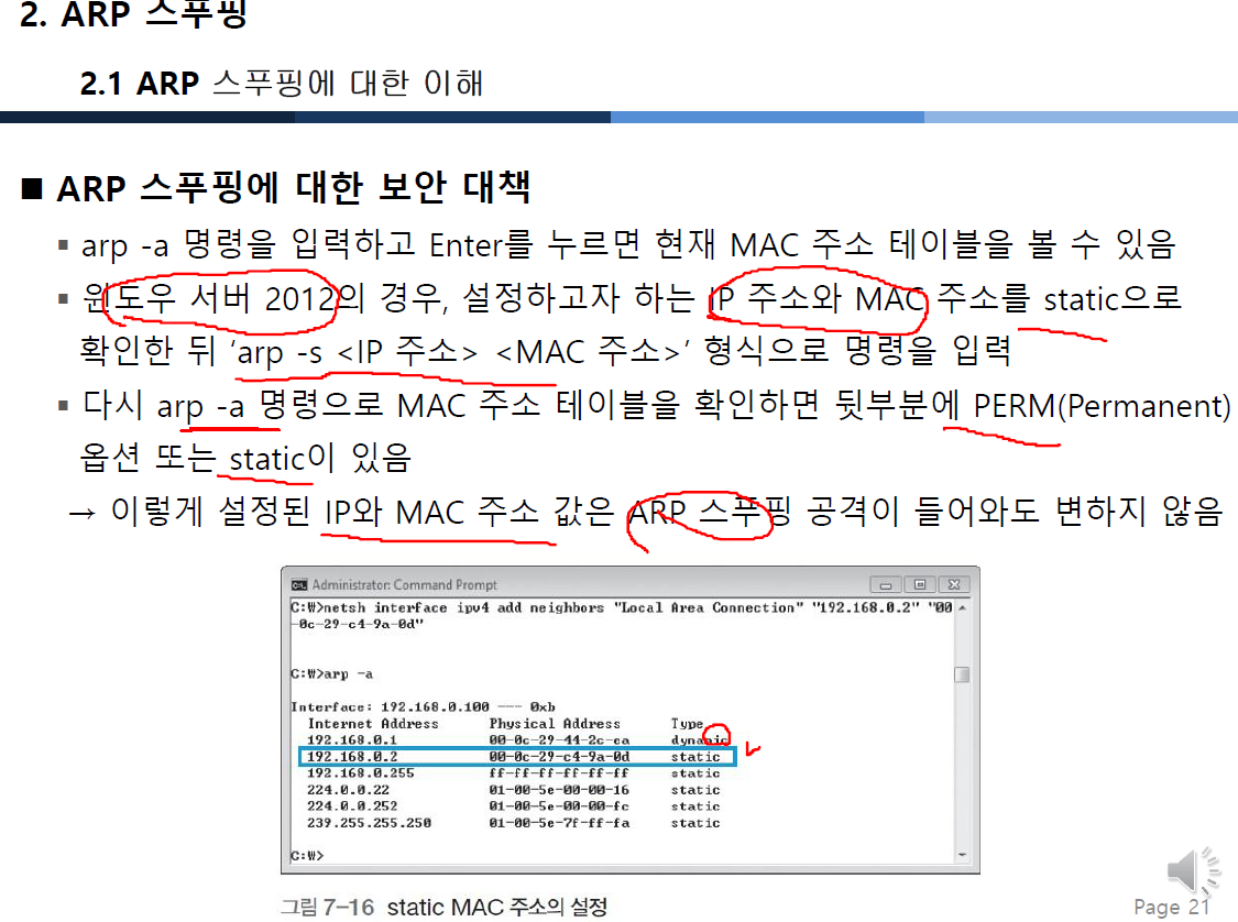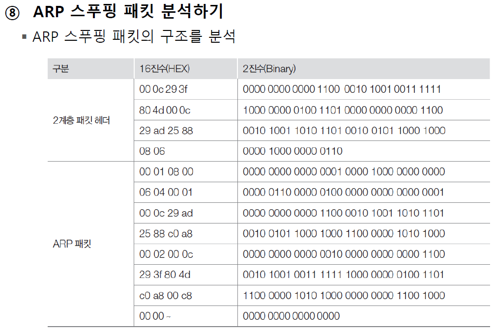 - arp -a 로 현재 IP 주소 값과 MAC 주소의 대칭 값 비교하여 엉뚱한 MAC 주소로 맵핑되어 있는 항목을 확인