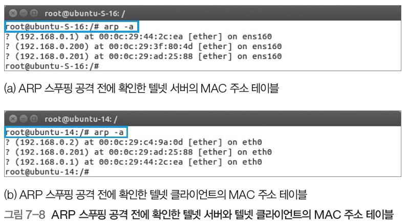 공격전에 서버와, 클라이언트의 MAC주소 테이블을 확인해봅시다.