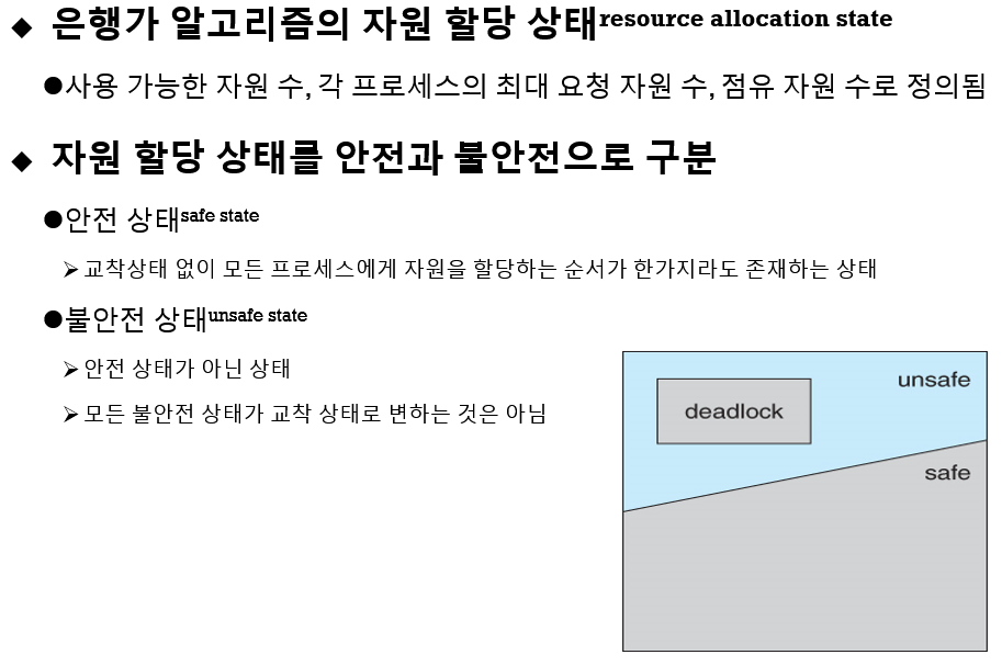 교착상태가 걸릴 수 도 있는 오른쪽 그림을 unsafe 상태라고 부릅니다.(교착상태가 될 수도 안될 수도 있는 상태)