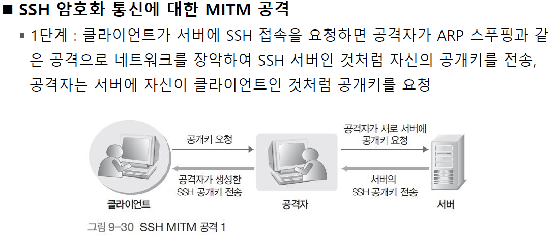 1 단계 : 클라이언트가 서버에 SSH 접속을 요청하면 공격자가 ARP 스푸핑과 같은 공격으로 네트워크를 장악하여 SSH 서버인 것처럼 자신(공격자)의 공개키를 전송 , 공격자는 서버에 자신이 클라이언트인 것처럼 공개키를 요청