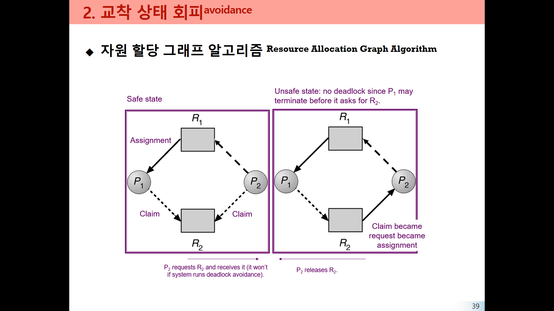 왼쪽 그림에서 P2가 R2를 요청하면 Resource-Request Algorithm으로 R2를 할당하여 오른쪽 그림같이 됩니다.