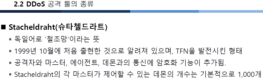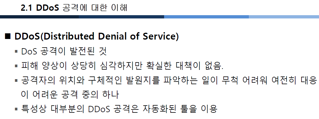 - 소량의 트래픽을 이용한 공격으로 오랜 시간에 걸쳐 서서히 공격이 진행되어 탐지가 어려움