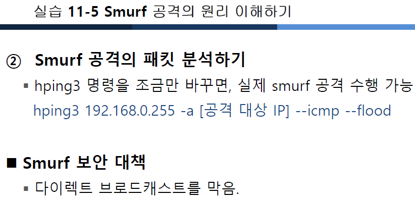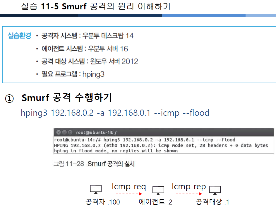 실제 공격을 보낼 때 syn, udp, icmp, smurf 공격을 다양하게 사용합니다.