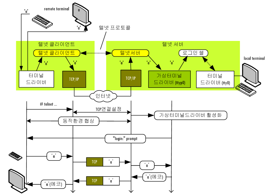 텔넷은 tcp/ip를 통해서 텔넷 메시지가 전송이 됩니다.