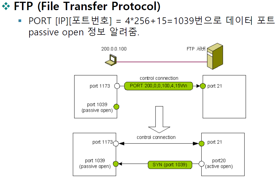 - 하나는 control connection이라고 해서 커맨드가 전송이 됩니다.