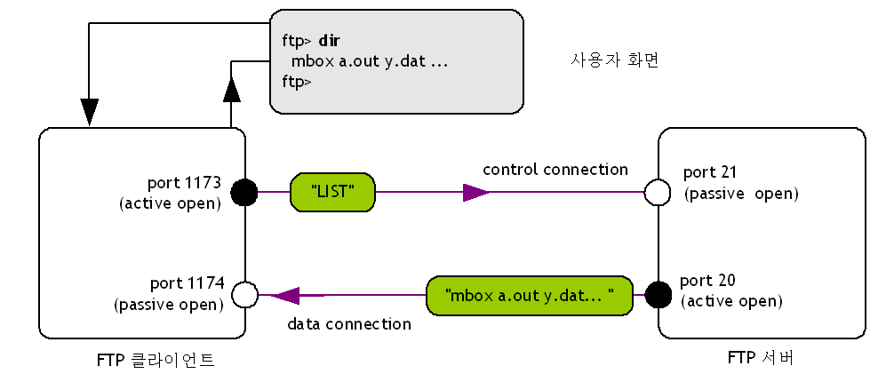 - 파일이 전송되는 data connection 이 있습니다.