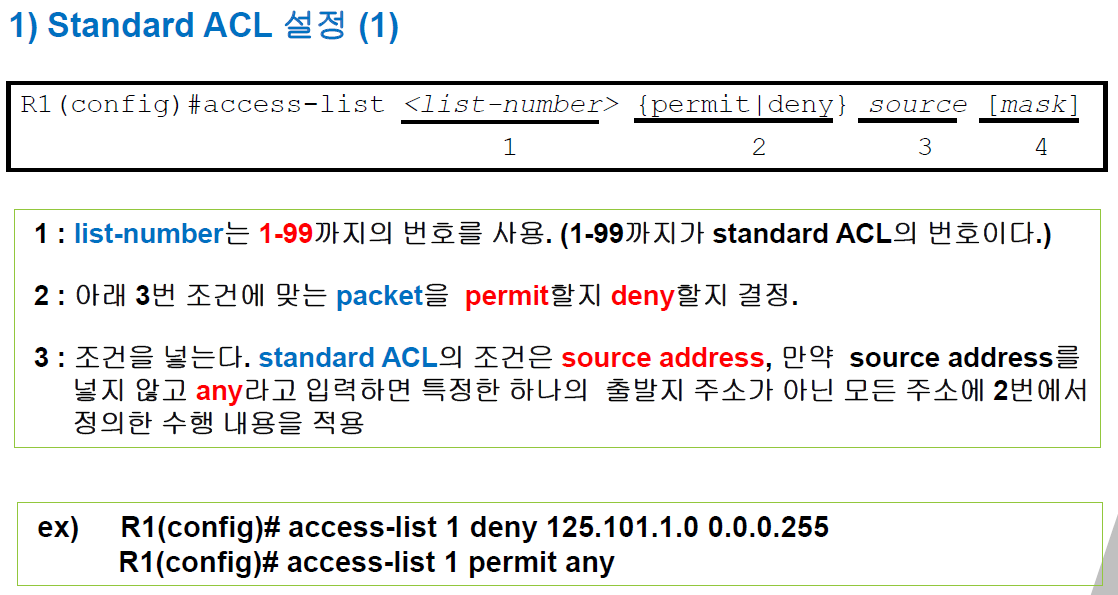 ex) R1(config)# access-list 1 deny 125.101.1.0 0.0.0.255