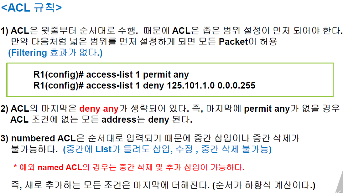 넓은 범위 설정을 하면 뒤에 명령어를 보지도 않고 실행합니다. - 마지막 명령어가 permit any가 없다면 deny any를 마지막에 써줍니다.